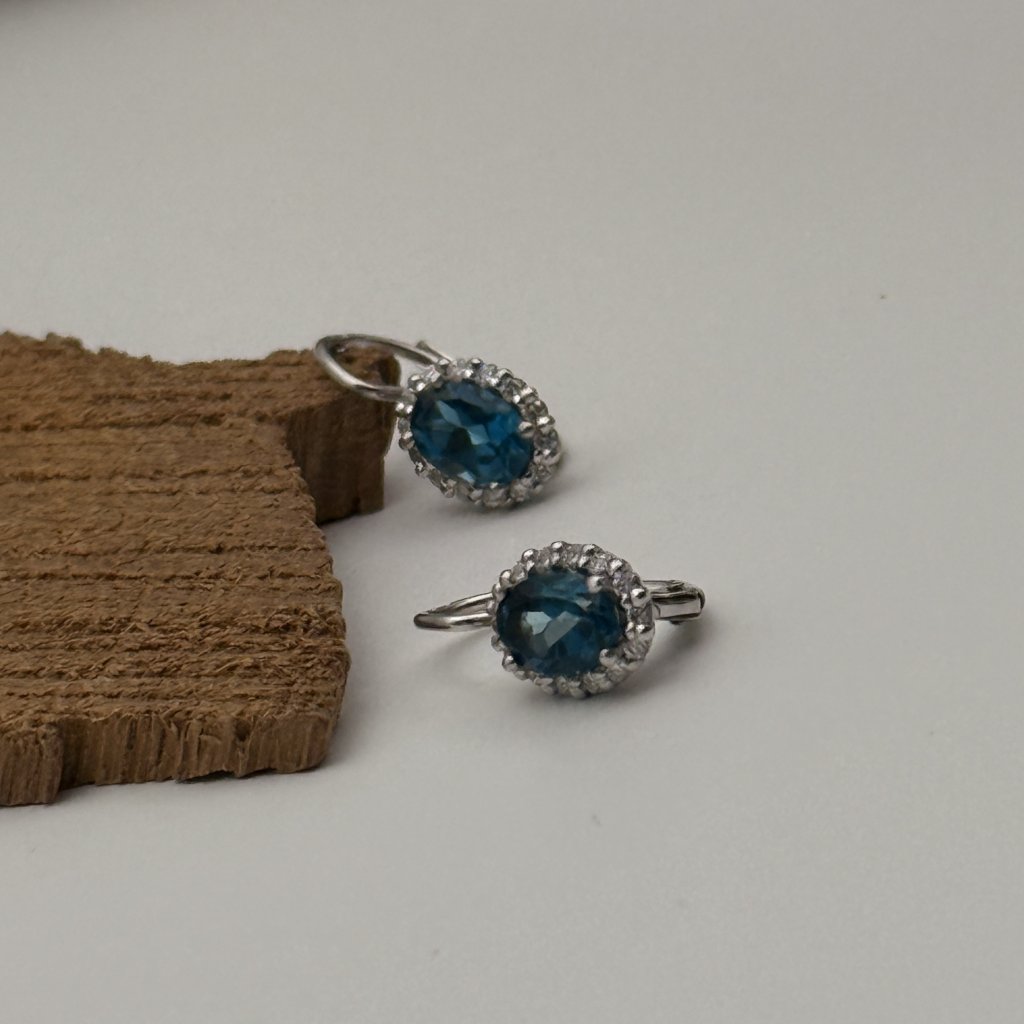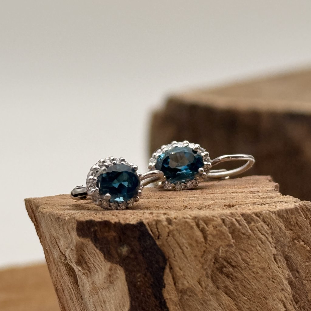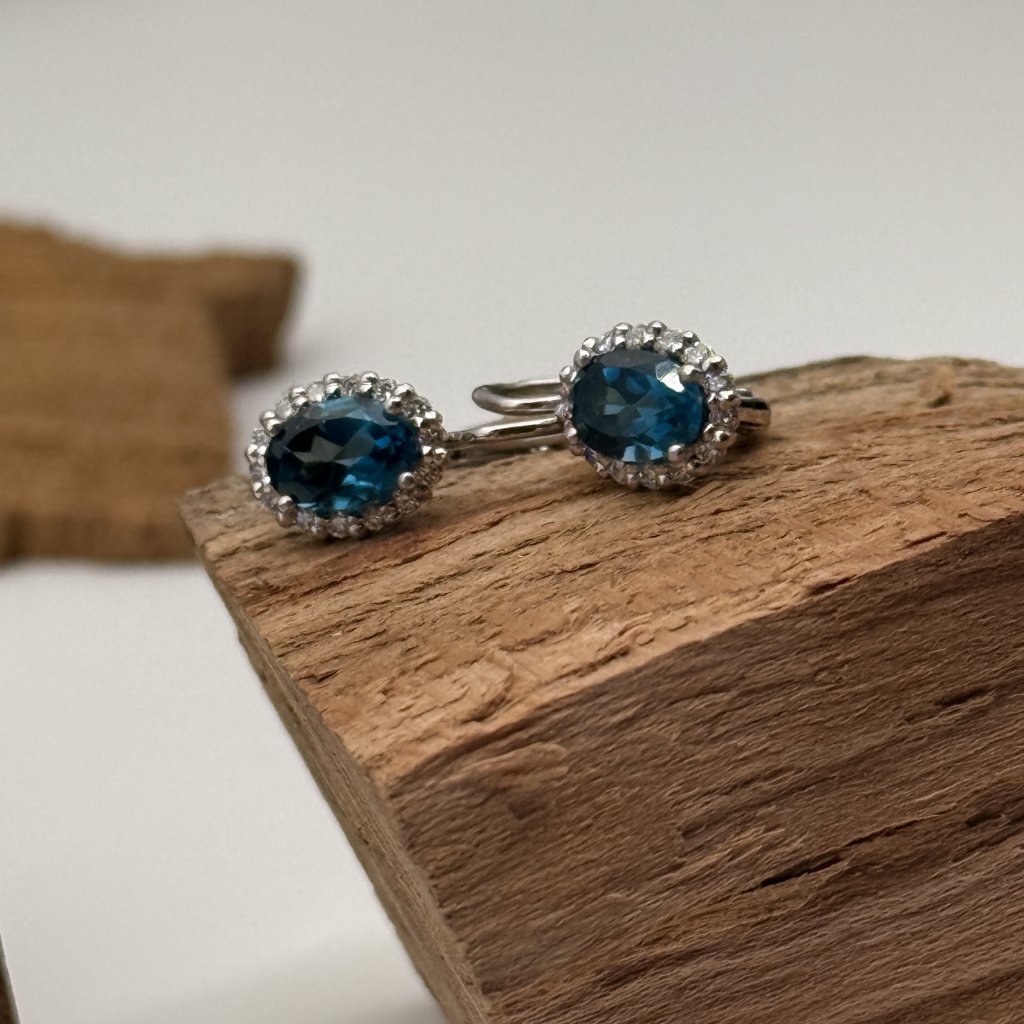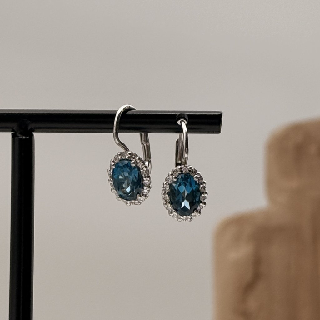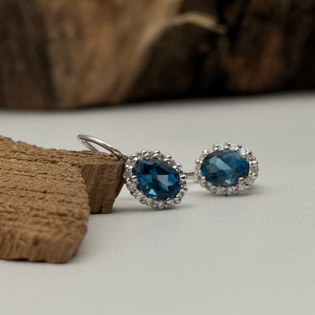 Briliantové naušnice s přírodními topazy v barvě London Blue /2,0ct/. Naušnice jsou osázeny brilianty o celkové hmotnosti 0,28ct, které se pyšní čistotou VS a barvou F.