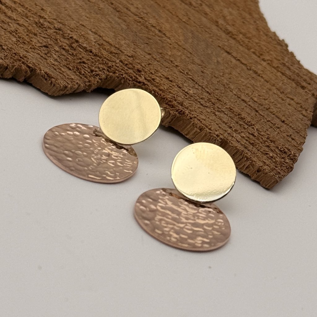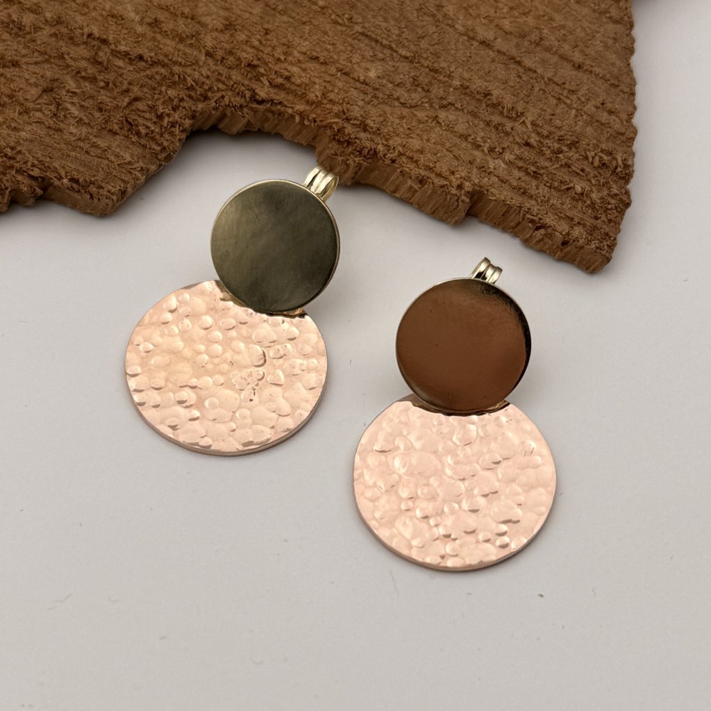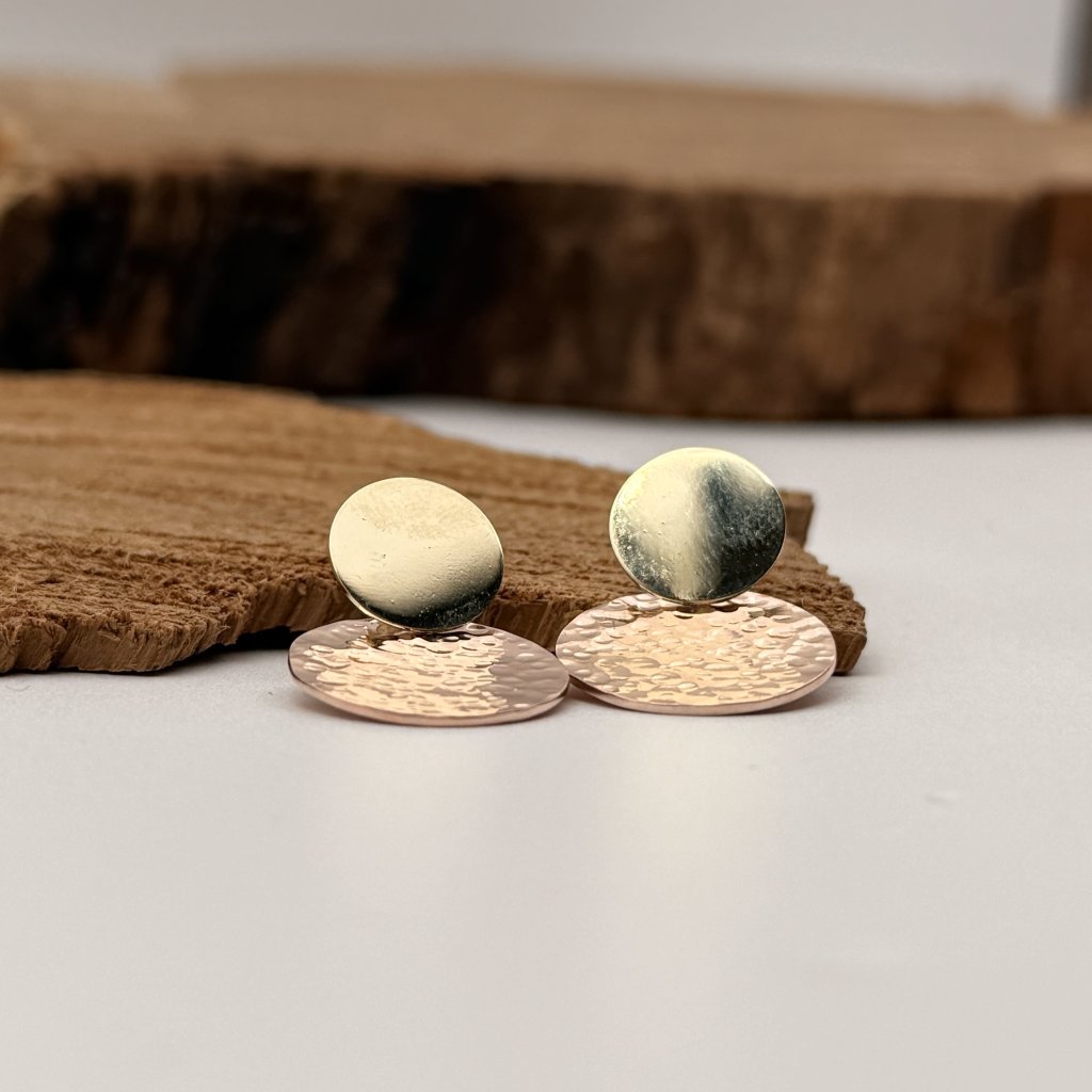 Menší žluté kolečko je lesklé, a větší kolečko z růžového zlata má kladívkovou texturu a je v matu.