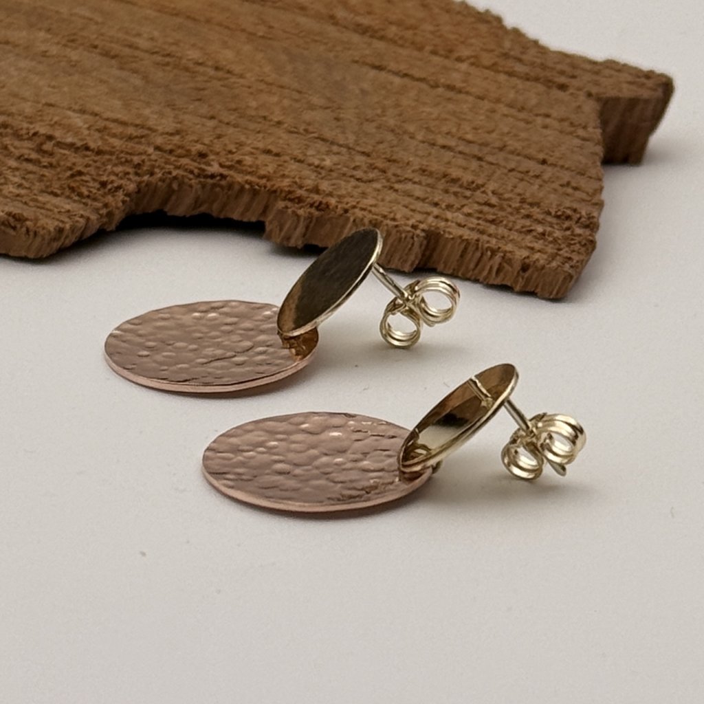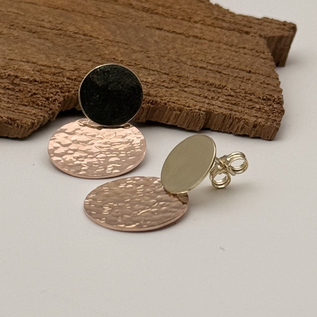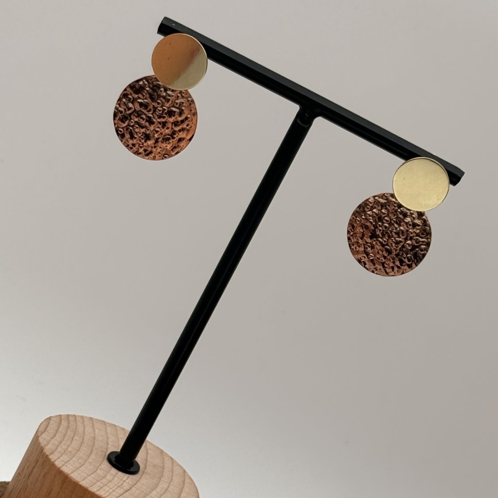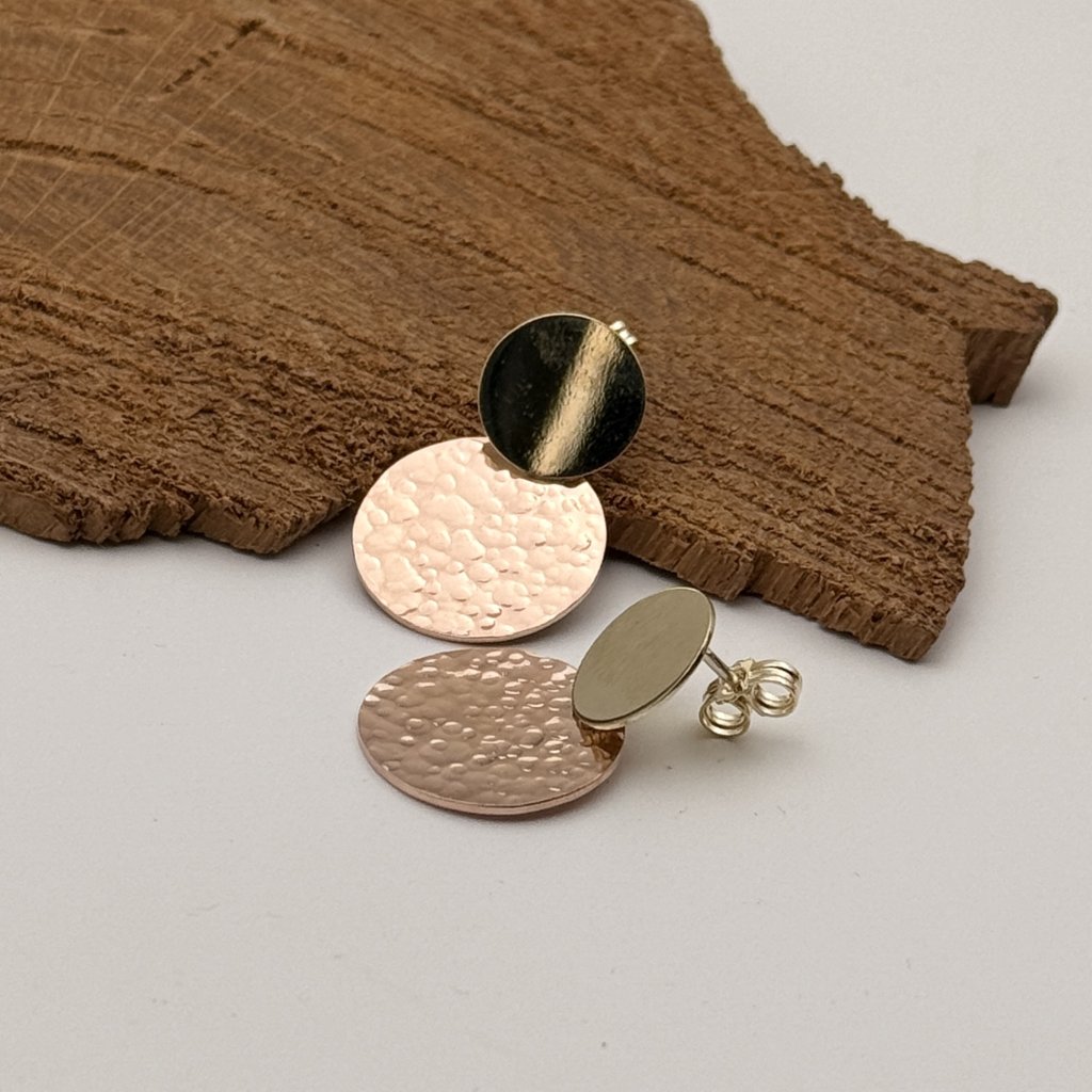 Menší žluté kolečko je lesklé, a větší kolečko z růžového zlata má kladívkovou texturu a je v matu.