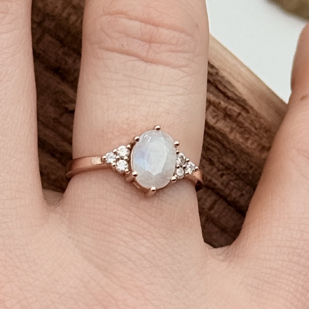 Jemný prsten s měsíčním kamenem, který v sobě ukrývá klidnou krásu noční oblohy. Jeho mléčný třpyt se mění s každým pohybem a dodává šperku tichou, éterickou eleganci.