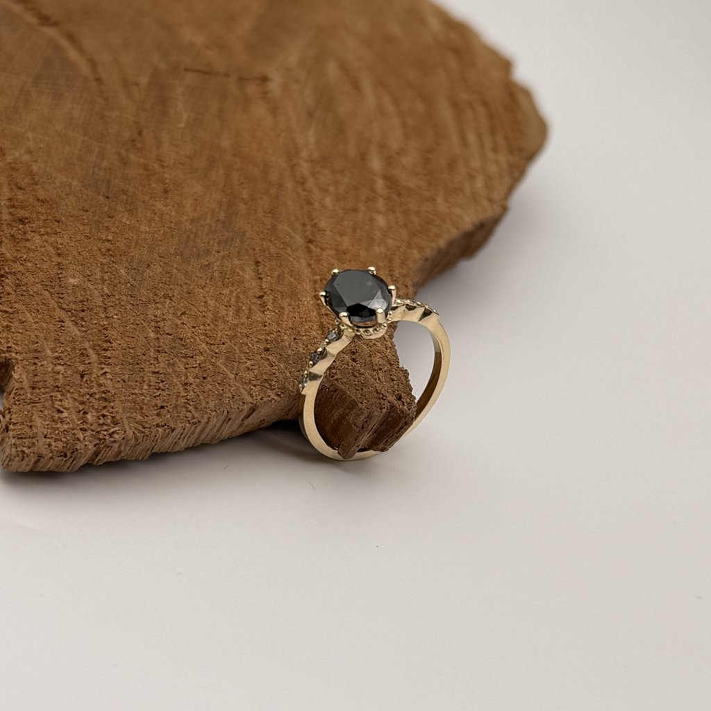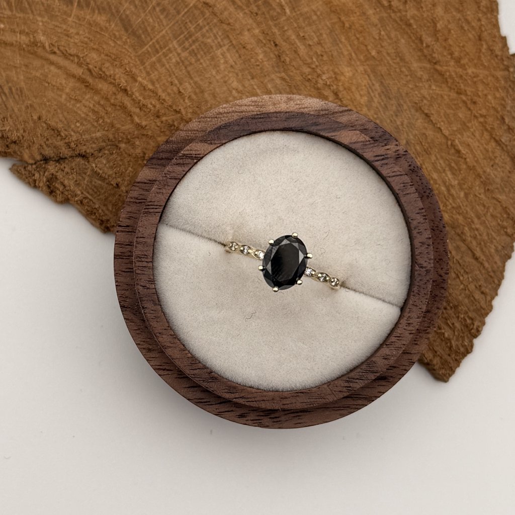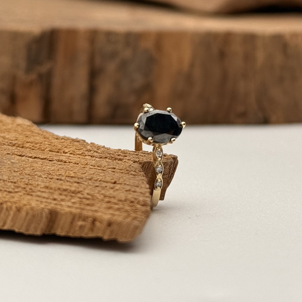 Nádherný prsten s velkým černým diamantem v oválném brusu zdobený malýmí bílými brilianty. Toto je dokonalý zásnubní prsten!