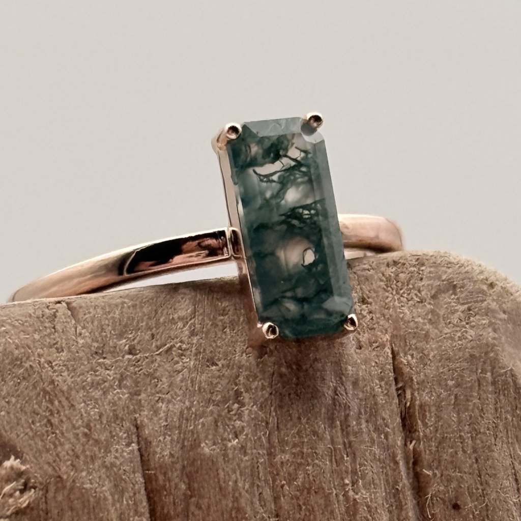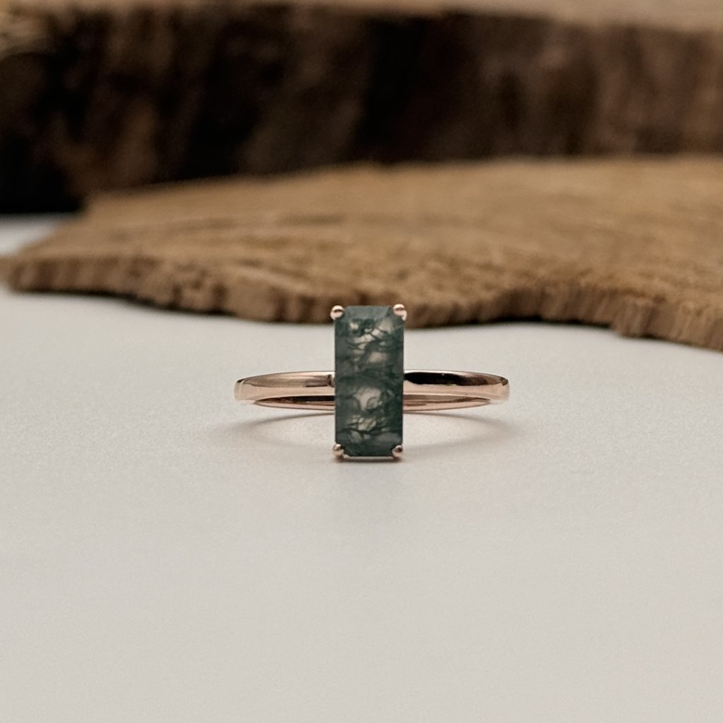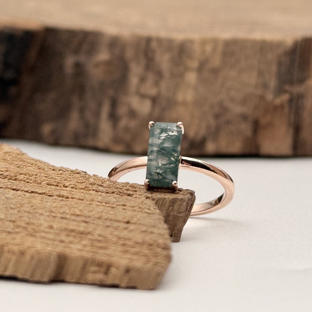 Prsten z kolekce TAJEMSVÍ LESA. Obdelníkový krásný mechový achát, s nádhernými mechovými inkuzemi. Kámen je ve velikosti 11x4,5mm.