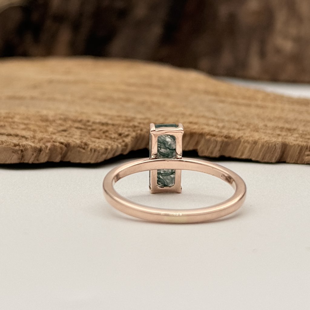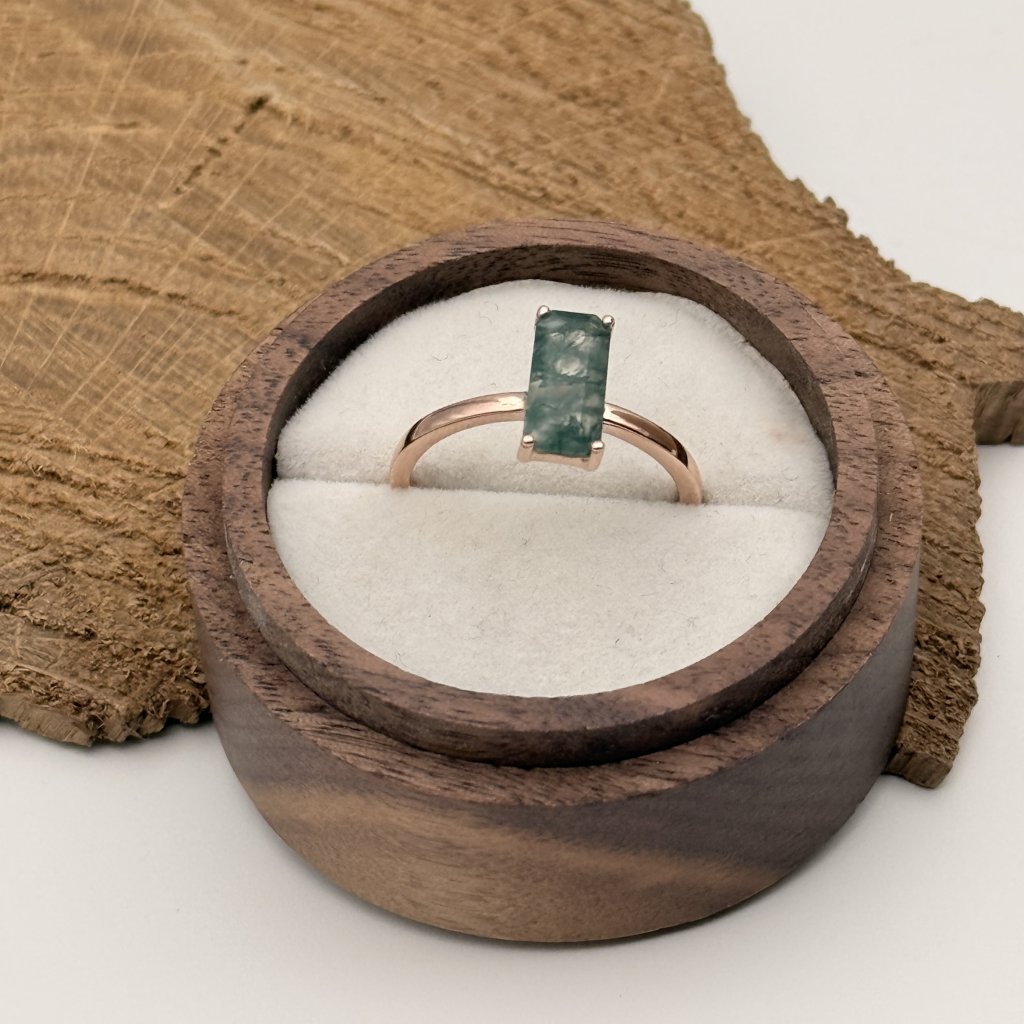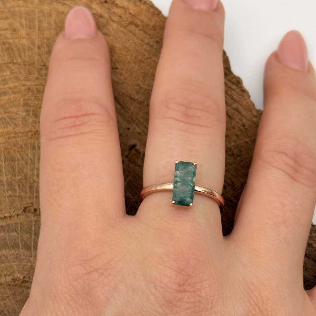Prsten z kolekce TAJEMSVÍ LESA. Obdelníkový krásný mechový achát, s nádhernými mechovými inkuzemi. Kámen je ve velikosti 11x4,5mm.